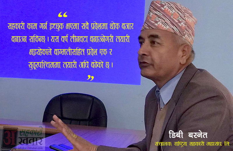 सहकारीले उत्पादन र बजारीकरणमा उल्लेख्य टेवा पर्याउन सकिरहेका छैनन् । देशभर करिब ३० हजार सहकारीमध्ये आधा भन्दा बढीले बचत तथा ऋणको कारोबार गर्छन् । उत्पादन र बजारीकरणमा सहकारीको योगदान बढाउन सरकारले सहकारी ऐन २०७४ र सहकारी नियमावली २०७५ मा विशिष्टीकृत सहकारी संघको अवधारणा ल्याएको छ । राष्ट्रिय सहकारी महासंघको पहलमा सातै प्रदेशमा थोक उपभोक्ता पसल सञ्चालन गर्ने तयारी अघि बढेको छ । सरकारले समेत बजेटमा सहकारीमार्फत सातै प्रदेशमा उपभोक्ता पसल सञ्चालन गर्ने घोषणा गरेको थियो । यसै सन्दर्भमा राष्ट्रिय सहकारी महासंघका सञ्चालक डिबी बस्नेतसँग सहकारी अखवारले गरेको कुराकानी ।
