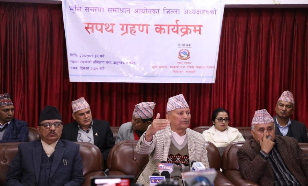 भूमि समस्या समाधान आयोगका जिल्ला अध्यक्षहरुलाई ३ बर्षभित्र सबै जिल्लामा देखिएका भूमि समस्या स्थायीरुपमा समाधान गर्ने गरी काम गर्न मन्त्री अधिकारीले निर्देशन समेत दिएका छन् । कार्यक्रममा ७१ जिल्लाका भूमि समस्या समाधान आयोगका जिल्ला अध्यक्षहरुलाई मन्त्री अधिकारीले सपथ गराएका थिए । सपथ हुन नसकेका ६ जिल्ला सदस्यहरुको सम्वन्धीत प्रदेशमै सपथग्रहण कार्यक्रम आयोजना गरिने मन्त्रालयले जनाएको छ ।