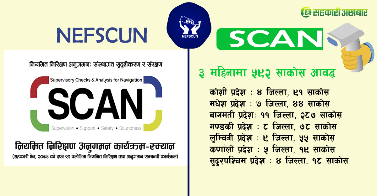 यस कार्यक्रममा संघमा आवद्ध सबै सदस्यहरुलाई सहभागि गराईने छ । स्क्यान कार्यक्रम गुणस्तर सुनिश्चितता, जोखिम सुपरिवेक्षण, व्यवस्थापकीय क्षमता विकास, स्वनियमन र नियामकीय सक्षमता विकासको एकिकृत स्वरुप हो । नेफ्स्कूनले ‘स्क्यान’ को औपचारिक सुरुआत काठमाडौंको ॐ साईराम बचत तथा ऋण सहकारी संस्था बालाजुबाट गरेको थियो ।