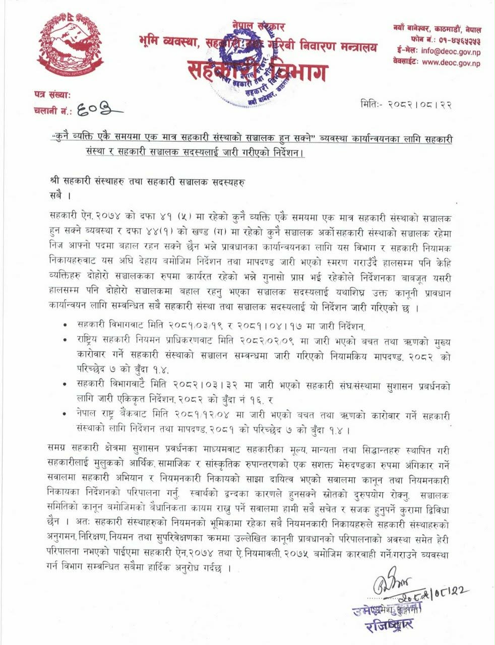 त्यसैगरी विभागले पून मंसिर २२ गते दोहोरो पद कार्यन्वयनकोलागि ‘कुनै व्यक्ति एकै समयमा एक मात्र सहकारी संस्थाको सञ्चालक हुनसक्ने’ ब्यवस्था कार्यान्वयनका लागि भन्दै निर्देशन जारी गरेको छ। त्यसैगरी विभागको बुँताले नभ्याएपनि राष्ट्रिय सहकारी नियमन प्राधिकरण र नेपाल राष्ट्र बैंकको निर्देशन पनि सम्झाएको देखिन्छ ।